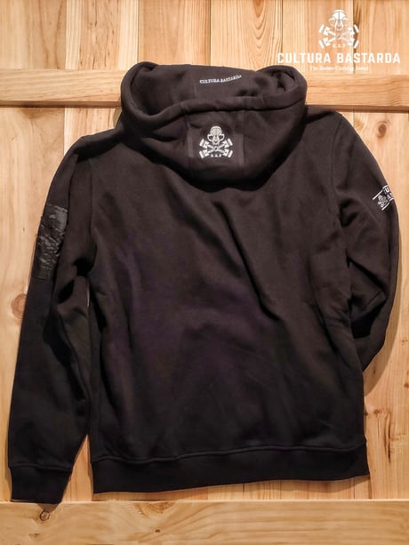 Sudadera negra de gran calidad con detalles Bomber en mangas y bolsillo frontal tipo canguro.
